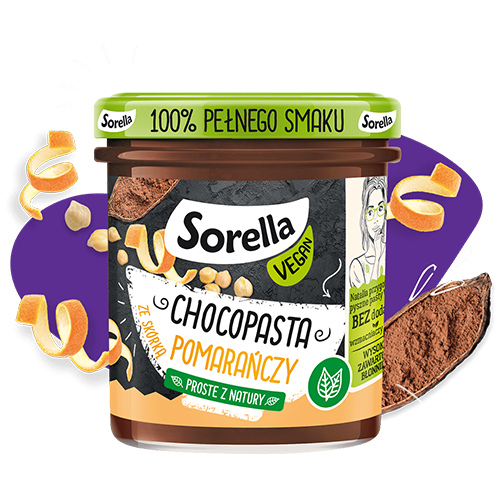 Gotowana ciecierzycy o wysokiej zawartości błonnika oraz kakao, które jest cennym źródłem witamin z grupy B stanowią bazę dla pasty. Jej dodatkiem jest skórka soczystej pomarańczy, która dostarcza cennych witamin oraz nadaje niezwykle świeży i aromatyczny smak.